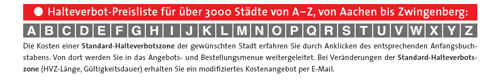 Hier geht es direkt zu unseren Halteverbot TOP 24 Städten:  Halteverbot-Aachen  Halteverbot-Berlin  Halteverbot-Bochum  Halteverbot-Bonn  Halteverbot-Bremen  Halteverbot-Dortmund  Halteverbot-Dresden  Halteverbot-Duesseldorf  Halteverbot-Duisburg  Halteverbot-Essen  Halteverbot-Frankfurt  Halteverbot-Hamburg  Halteverbot-Hannover  Halteverbot-Heidelberg  Halteverbot-Karlsruhe  Halteverbot-Koeln  Halteverbot-Leipzig  Halteverbot-Mainz  Halteverbot-Mannheim  Halteverbot-Muenchen  Halteverbot-Nuernberg  Halteverbot-Potsdam  Halteverbot-Stuttgart  Halteverbot-Wiesbaden  Halteverbot-Würzburg